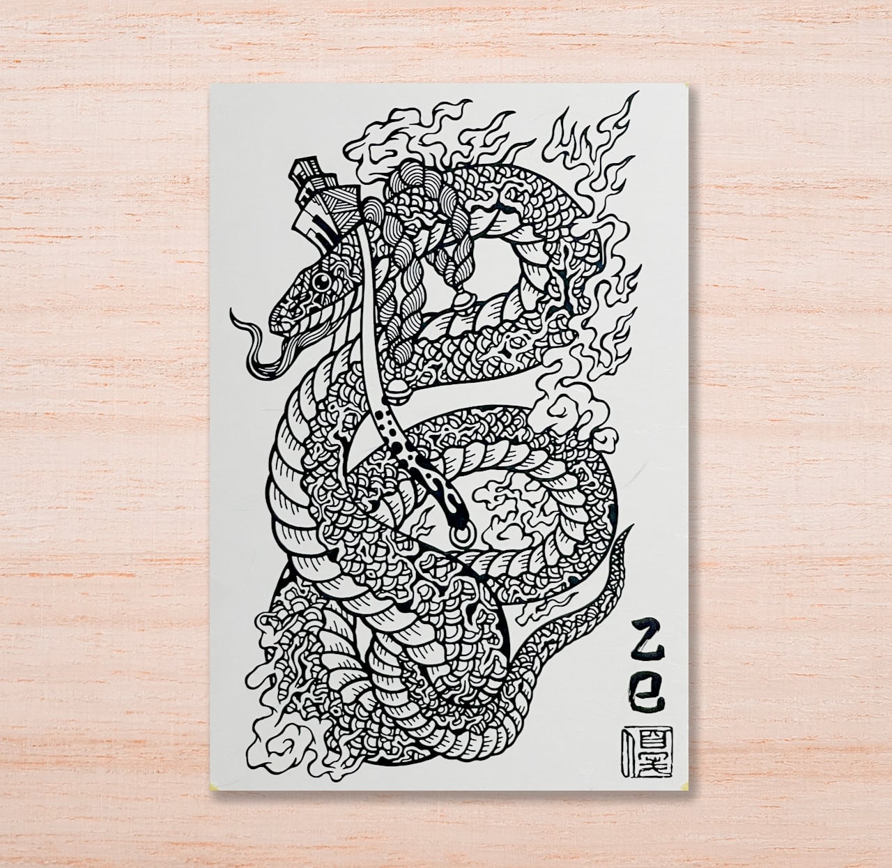 緻密なペン画で描かれた巳は、力強さや神秘的な魅力があります。